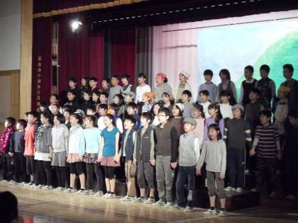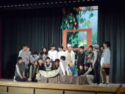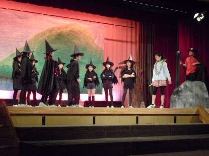魔女の学校に通うマジョリンと、村の人たち・・・。6年生は最高学年として立派に演じました。また、大道具や照明も自分たちで動かして劇を作り上げました。演じきった笑顔を輝かせ、歌う姿が印象的です。