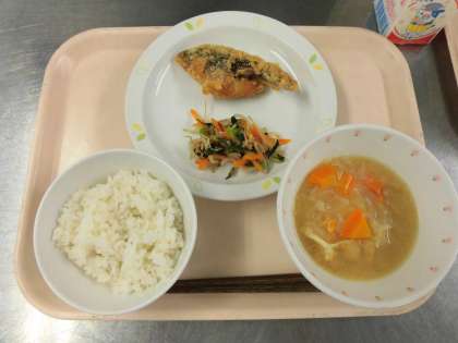 今日の給食には、大麦、えのきだけ、切り干し大根など、食物繊維が多く含まれる食材を使っています。食物繊維には、水溶性(みずにとける)と不溶性(みずにとけない)があります。どちらもバランスよく摂ると、おなかの調子をよくするはたらきがあります。さらに、発酵食品(ヨーグルトやチーズや納豆、お漬物など)を食べると、おなかの中でよいはたらきをする「腸内細菌」も増えます。給食をしっかり食べて、おうちでのおやつには、ヨーグルトやチーズを食べてみてください。
