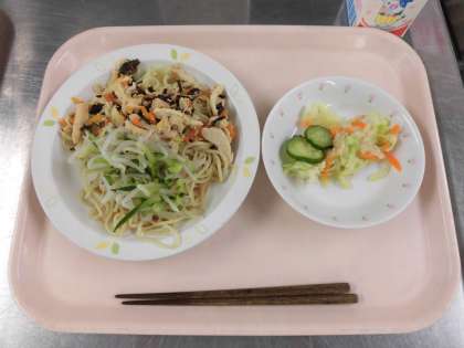 暑い日が続くと食欲がなくなりがちですが、そんな時はツルツルっと食べられる麺類がおいしいですね。今日は給食室特製冷やし中華です。鶏肉ときくらげと野菜を入れて煮た具と、きゅうりともやしを麺にのせて、冷たいおつゆをかけていただきます。ツルッと食べやすいですが、よくかんで食べてほしいなと思います。