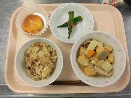 シシジューシーの「シシ」は、「ぶたにく」のことで、ジューシーは炊き込みごはんのことです。イナムドゥチの、イナは「いのしし」のこと、「ムドゥチ」は、「もどき」のことで、いのししもどきという意味があるそうです。いのしし肉ではなくて豚肉を使ったものです。パインケーキも給食室特製です。