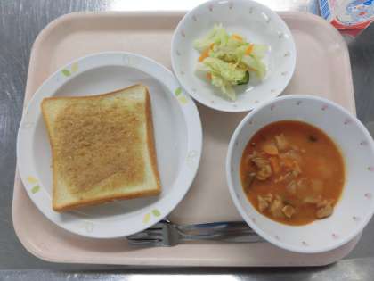 セサミトーストは、すりごま、バター、油、砂糖を混ぜ合わせて、パンにぬってオーブンで焼きました。フレンチサラダは、野菜を茹でて真空冷却器という機械で冷やして、たまねぎとりんご入りの給食室特製のドレッシングで和えました。給食では、子どもたちの安全のために生野菜を出せませんが、ゆで加減に気を付けたり、真空冷却器で冷やしたり、手作りドレッシングで和えたりして、生野菜サラダに負けない美味しいサラダを目指しています。