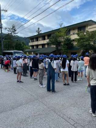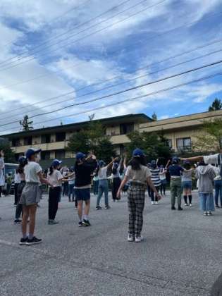 予報は雨でしたが、まだ晴れています。爽やかな空気の中、朝会ができました。