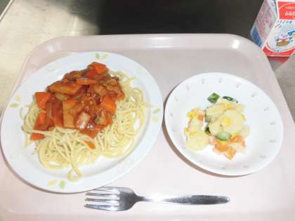 2学期初めの給食はスパゲッティ地中海ソースです。ソースは、イカやエビ、あさりなどの魚介類をたっぷり使ったトマトベースのソースです。コトコト煮込んでとても美味しく出来上がりました。