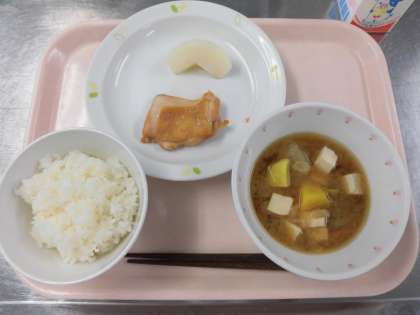 今日のデザートは、梨です。栃木県で収穫された「豊水」という名前の梨が届きました。名前のとおり、果汁が多く、ジューシーで甘くて、シャリシャリとした食感がおいしいです。梨は、今が旬でおいしい時期です。豊水は、「幸水」という梨をもとに誕生した梨だそうです。梨には色々な種類があります。給食でもいくつかの種類の梨が登場します。楽しみにしていてください。