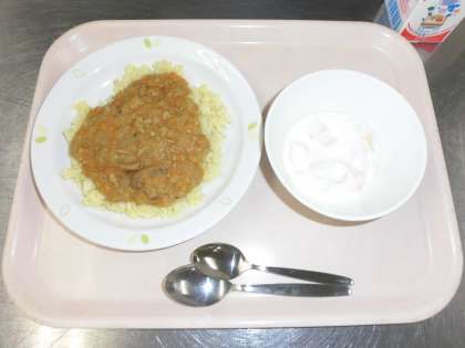 今日のドライカレーには、豚挽き肉と一緒に豚レバーを炒めて入れました。お肉は、体の筋肉や血を作る材料になる栄養素が多く含まれています。特にレバーは、血を作る材料の鉄分が多く含まれています。鉄分が足りなくなると、力がでなくなったり、めまいがしたり、運動もできなくなってしまいます。しっかり食べて、運動会の練習も元気にがんばってほしいなと思います。
