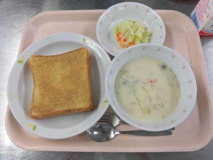 シチューには、これからが旬のサツマイモを入れました。さつまいもは、中国から日本に伝わったお芋です。関東地方には、昔、農作物が不作のときに薩摩藩(今の鹿児島県)から伝わったので、「さつまいも」と呼ばれるようになったそうです。食物繊維が多く、おなかの掃除をしてくれたり、ホクホクで甘くて美味しいです。