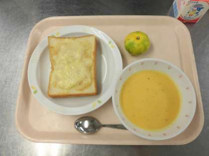 ツナポテト—ストは、蒸したじゃがいもと、炒めた玉ねぎと、ツナを混ぜ合わせて、食パンにのせてチーズをかけて、オーブンで焼いて作りました。キャロットポタージュは、にんじんとたまねぎを鶏がらスープで柔らかく煮て、ミキサーにかけ、牛乳や生クリームを混ぜ合わせて作りました。給食室のミキサーは、おうちのミキサーの10倍くらいの大きさです!調理員さんが特大ミキサーで10回にわけてミキシングして、美味しいスープが出来上がりました。