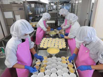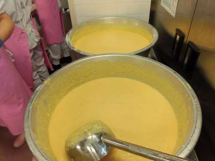 今月は読書月間ということで、本にちなんだ献立がいくつか登場します。今日は、「ぐりとぐら」のカステラを作りました。大きな卵をみつけて、フライパンで大きなカステラを作るお話です。給食室では、大きなタライを2つ使って、材料を混ぜて、ひとつひとつのカップに流しいれてオーブンで焼きました。多聞小全員分の材料を大きなタライで混ぜていると、本当にぐりとぐらになった気分になるくらいのたくさんの量でした。
