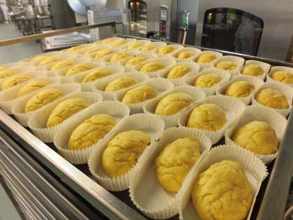 スイートポテトも給食室の手作りです。48kgのさつまいもを皮をむいて、蒸して、つぶして、砂糖や生クリーム、牛乳をまぜて、成形して、卵を塗って、オーブンで焼きました。とってもおいしく出来上がりました。
