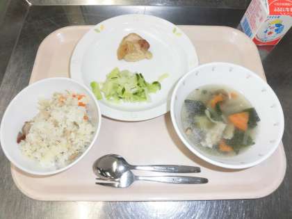 今日は給食委員会コラボメニューです。児童書で有名な「大どろぼう、ホッツェンプロッツ」シリーズに出てくる料理を給食にアレンジしました。ドイツのお話で、2人の少年が大どろぼうをつかまえるというワクワクどきどきの大冒険ストーリーです。給食のきのこスープは、しめじ・えのき・まいたけの三種類のきのこを入れて、旨みたっぷりの美味しいスープができました。
