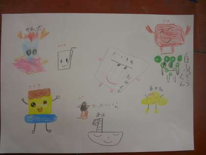 自分の好きなものに、目と手足をつけると、あっと言う間に「ともだち」ができたよ!えびくん、ペロペロキャンディちゃん、かみなりぼうや・・・。