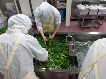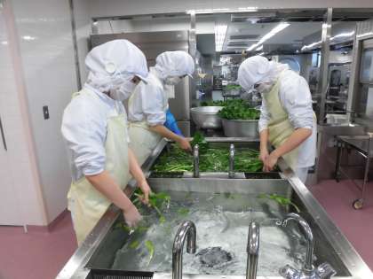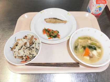 魚は、これから脂がのっておいしくなる鰤を、しょうが、お酒、しょうゆ、みりんに漬け込んで焼きました。野菜のからしあえには、小松菜がたっぷり入っています。小松菜は、一年中お店に並んでいますが、冬が旬の野菜です。カロテンや鉄分が多く含まれています。給食室では、小松菜などの葉物野菜は、葉っぱ一枚ごと3層のシンクで3回よく洗っています。野菜もしっかり食べて元気に過ごしてほしいなと思います。