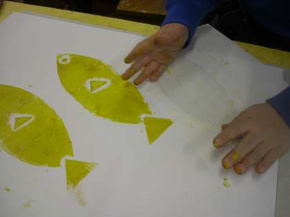 3年生3学期始めの作品は、紙版画です。工作用紙を切って好きな形に組み合わせて版を作ります。