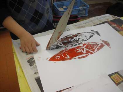 同じ形を何枚も刷ることができる楽しさ、色を変えると感じが変わることのおもしろさを感じながら進めています。どんな世界ができあがるでしょうか・・。
