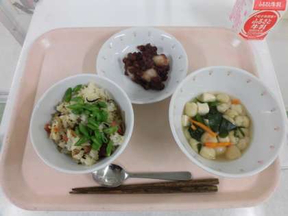 あさって日曜日は、小正月です。1年の豊作を先に祝って、もち花を飾ったり、お正月のお飾りやしめ縄を焼く「どんと焼き」が行われます。どんと焼きの火で焼いたおもちを食べたり、あずき粥を食べて「無病息災」を願います。給食では、白玉ぜんざいを作りました。どのクラスもよく食べていて、おかわりの行列ができていました。