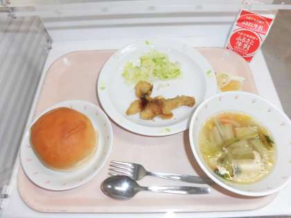 パンにフィッシュフライとキャベツをセルフではさんで食べてもらいました。