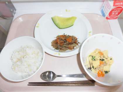 R5/6/28 本日の給食 公開日 2023/06/30 更新日 2023/06/30 給食 令和5年6月28日(水) <献立> ・発芽玄米入りごはん ・鶏肉と高野豆腐の卵とじ ・五目きんぴら ・メロン ・牛乳 いいね(0)