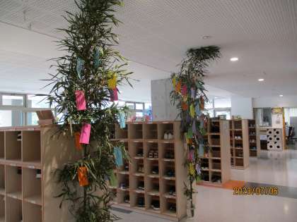 7月7日の七夕にあわせて、低学年の教室の前と第1昇降口とPTA会議室の前に七夕かざりを設置しています。短冊には、「友達と仲良くなれますように」や「家族の名前を漢字で書けますように」など、心温まる願いが書かれています。