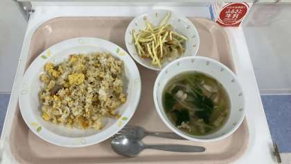 R5/9/19 本日の給食 公開日 2023/10/05 更新日 2023/10/05 給食 令和5年9月19日(火) <献立> ・チャーハン ・ワンタンスープ ・じゃがいもときゅうりの中華サラダ ・牛乳 いいね(0)