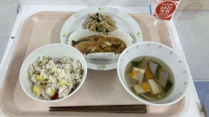 R5/9/26 本日の給食 公開日 2023/10/05 更新日 2023/10/05 給食 令和5年9月26日(火) <献立> ・さつまいもごはん ・鮭のチャンチャン焼き ・野菜のごまだれかけ ・根菜汁 ・牛乳 いいね(0)