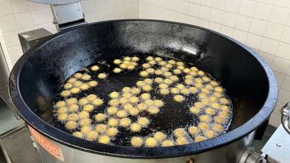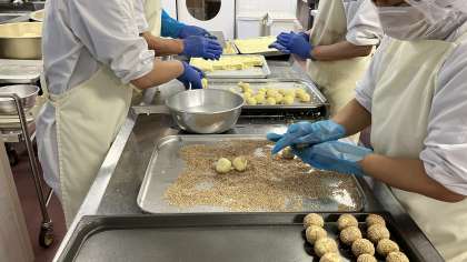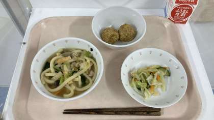 R5/10/19 本日の給食 公開日 2023/10/19 更新日 2023/10/19 給食 令和5年10月19日(木) <献立> ・みそ煮込みうどん ・即席漬け ・さつまいものごま団子 ・牛乳 今日は、さつまいものごま団子を作りました。 さつまいもを蒸してしっかりつぶした後、白玉粉を加えて混ぜ、 丸めてごまをまぶして油で揚げました。 約1600個のお団子を一つずつ丸めました。 なめらかでもっちりとした、ごまの香ばしい風味がおいしい、さつまいものお団子です。 いいね(0) 委員会・クラブ活動