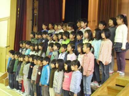 4月23日(月)の全校朝会で3年生による日本語音読発表会を行いました。萩原朔太郎の「竹」という詩を声を合わせて読むことができました。