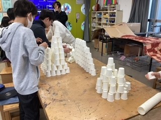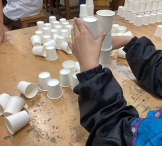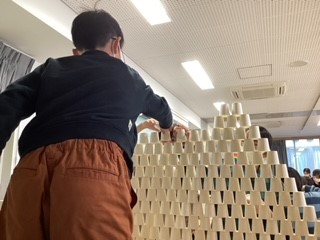 子どもたちは夢中で紙コップに関わり、バランス感覚の大切さや、出来上がる形の面白さに気付いている様子でした。