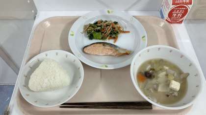 今日はそのころの給食の一部を再現して、給食室で一つずつ丁寧に握ったおにぎりと鮭の塩焼きです。