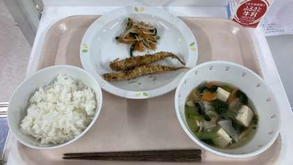 令和6年2月26日(月) <献立> ・ごはん ・ししゃもフライ ・おひたし ・吉野汁 ・牛乳