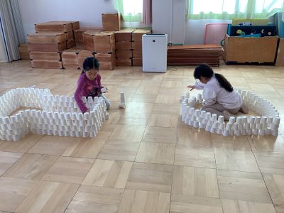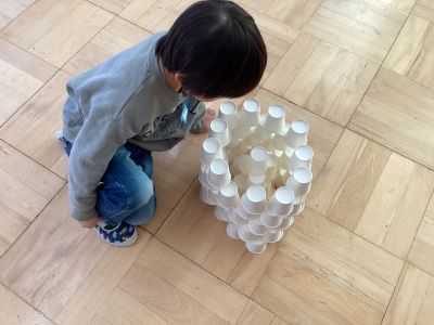 多聞幼稚園で、紙コップの造形遊びの授業を実施しました。たくさんの紙コップを重ねたり並べたりして、それぞれ思い付いたものをつくりました。高く積み上げることに夢中になったり、自分が入れるようなベッドをつくったり、のびのびと活動しました。