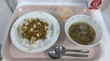 令和6年2月28日(水) <献立> ・麻婆豆腐丼 ・中華スープ ・フルーツゼリー ・牛乳