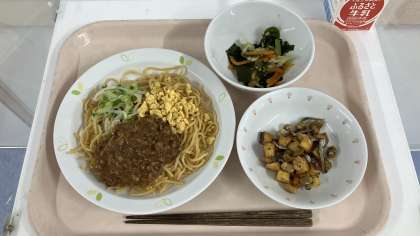 令和6年5月7日(火) <献立> ・ジャージャー麵 ・わかめのナムル ・カラフルビーンズ ・牛乳