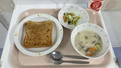 R6/5/13 給食 公開日 2024/05/13 更新日 2024/05/13 給食 令和6年5月13日(月) <献立> ・セサミトースト ・さつまいもシチュー ・キャベツサラダ ・牛乳 いいね(0)