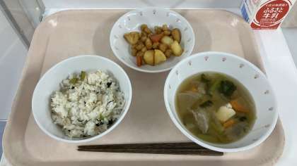 令和6年5月16日(木) <献立> ・菜飯 ・魚のつみれ汁 ・新じゃがいもの甘辛煮 ・牛乳