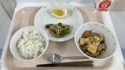 令和6年5月31日(金) <献立> ・麦ごはん ・家常豆腐 ・ナムル ・河内晩柑 ・牛乳