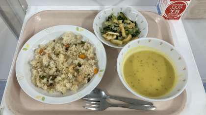 R6/6/17 給食 公開日 2024/06/17 更新日 2024/06/17 給食 令和6年6月17日(月) <献立> ・シーフードピラフ ・カリカリ油揚げのサラダ ・豆乳ポタージュ ・牛乳 いいね(0)