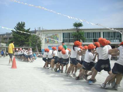 全校児童による綱引きで決着がつき、今年度は白組の優勝です。