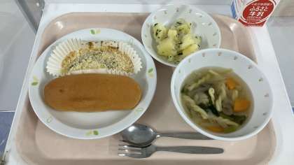 R6/6/25 給食 公開日 2024/06/25 更新日 2024/06/25 給食 令和6年6月25日(火) <献立> ・米粉入りパン ・アジのガーリック焼き ・パセリポテト ・マカロニ入りコンソメスープ ・牛乳 いいね(0)