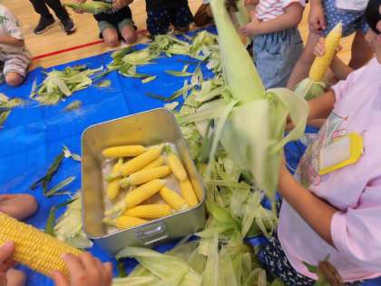 今日は、1時間目に1年生のみなさんがとうもろこしの皮をむいてくれました。