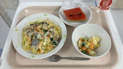 令和6年7月9日(火) <献立> ・スパゲティクリームソース ・マセドアンサラダ ・すいか ・牛乳