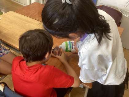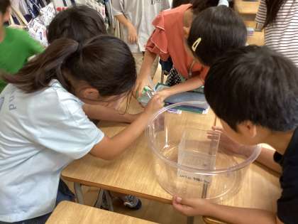 算数で『水のかさのたんい』の学習をしました。容器に入る水の量を、デシリットルますで何倍分になるかを調べました。「こぼれないように持つね。」「そのくらいでいいよ。」と、声を掛け合いながら友達と協力して調べることができました。