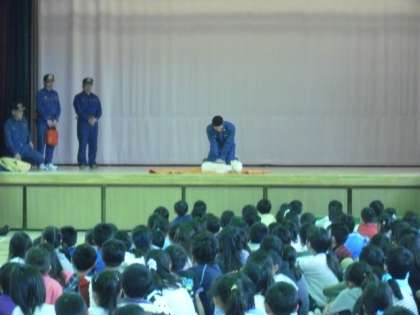 避難訓練の後、消防署・消防団の方による実演を交えたお話を伺いました。緊急時の対応の仕方や担架・AEDの使い方などを学びました。