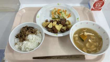 今日の給食では、いつもは捨てられてしまうだしをとった後の昆布と鰹節を再利用してふりかけを作りました。