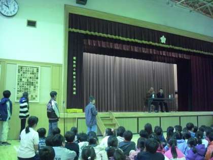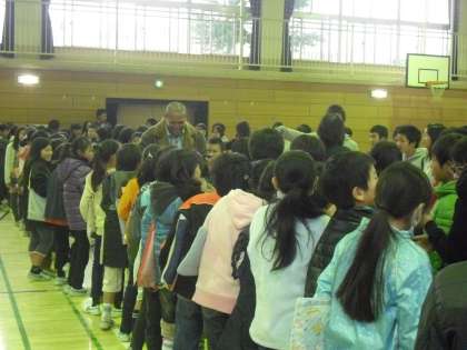 「夢に向かって」というテーマで、将来夢を叶えるために今必要なことをお話しくださいました。さらに、5・6年の代表児童の質問に答えたり、全校児童とハイタッチをして歩いたりし、ラミレス選手のファンを大切に思う気持ちが伝わってきて、皆感動しました。