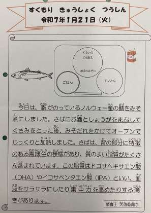 令和7年1月21日(火) <献立> ・ごはん ・さばの味噌煮 ・野菜ののり和え ・すいとん ・牛乳