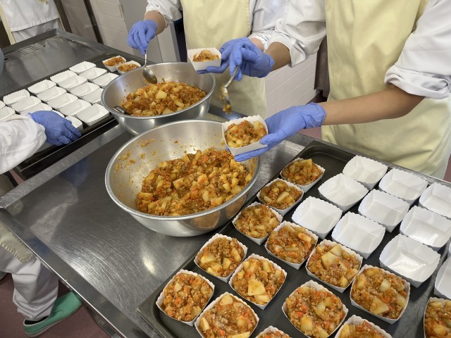 炒めてミートソースを作り、蒸したじゃがいもと合わせます。この具をカップに入れ、