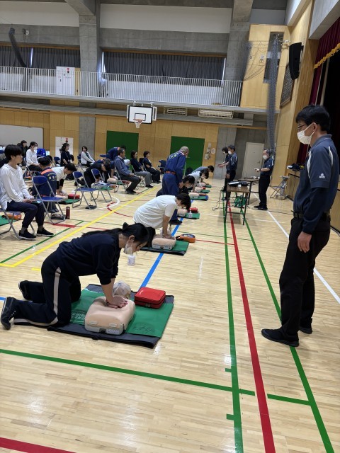 本日の午後は、教員の救命救急訓練を行いました。毎年この時期に「もしも」のことがあった場合に少しでも子どもたちの命を救えるようにと行われている研修です。水泳の授業だけでなく、日常の体育の時間やそれ以外の授業、休み時間など、救命救急対応が必要になった時、救急隊員が到着するまでの初期対応が大切と言われています。そのために、訓練用の人形を使っての心配蘇生訓練やAEDの使用訓練等を行いました。