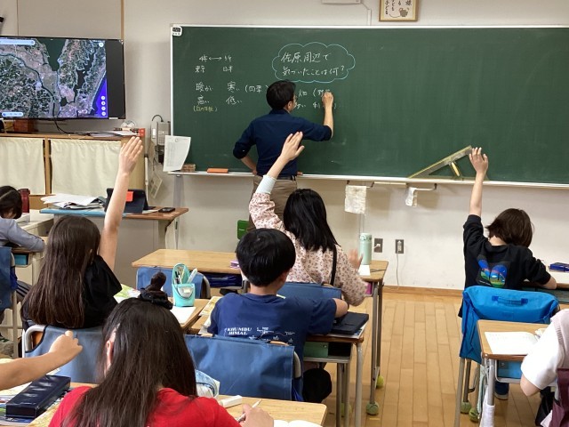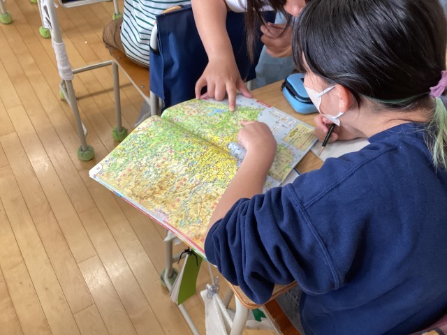 5年生での社会では、これまで日本の国土の特徴を地形や気候などの面から地図帳などを使って学習してきました。多聞小学校は、「丘の学校」と呼ばれていますが、学校の周りの微妙な土地の高低差を子どもたちに感じてもらうためにストリートビューの画像を使って「旅」をしていました。今日は、低い土地のくらしの学習の入り口。地図帳で「60ベージのクの3」の香取と佐原を探し、その周りの様子を地図帳から読み取りました。子供たちは、「田が多い」「川や湖がある」など低地の特徴を見つけ出します。そして再び上空の映像からストリートビューの画像へ。「川が多い」「田が多く米を作っている」など低地の景色から特徴を確かめていました。