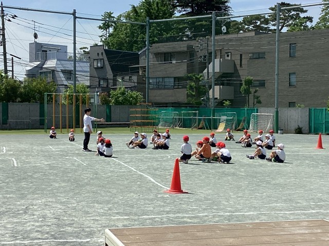 3年生は、ボールを使ったゲーム。ルールをしっかり聞き、友達と意思疎通を図りながらボールを取ることができたら座ります。チームワークよく、頑張っていました。