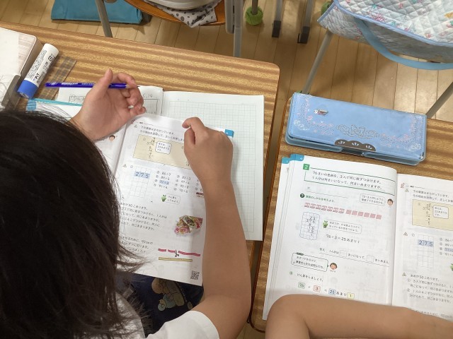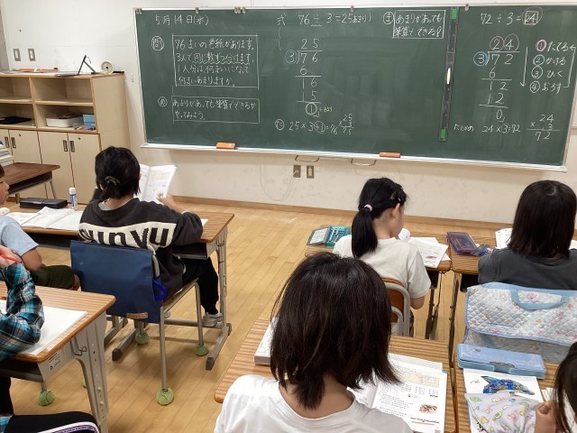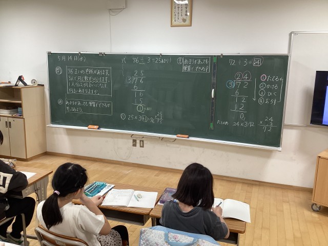 今日の4年生の算数は、わり算の筆算の仕方の学習です。2けた÷1けたの計算の仕方をマスターします。これまでは、横に書く式で暗算的に解いていましたが、計算が複雑になってくると必要なのが「筆算」。まずは九九があやしい状態だと大変です。要復習です。ここでしっかりわり算の計算ができるようにしておかないと今後大変です。高学年では、図形の面積、速さ、割合、体積・・・いたるところにわり算の計算が出てきます。いくら「速さ」を求める公式が分かっても計算ができなくては答えにたどりつけません。今後高学年の算数で大切になってくるわり算の計算。今のうちにしっかりマスターしておきましょう。4年生以上のお子さんがいるご家庭では、お子さんがわり算の計算ができるか「要チェック」です。これまで算数で躓いていても、計算ができるようになったことで算数の理解度が上がった子供をたくさん見てきました。